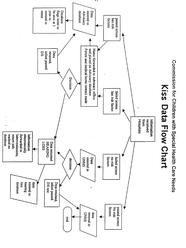 Goal 4 is to improve the data management and tracking of Universal Newborn Hearing Screening in Kentucky. By improving data management and follow-up tracking through enhanced technology and expansion of the existing Hearing High Risk Registry, the Kiss Project will be able to accurately assess needs related to UNHS. The KY Commission is dedicated to providing resources for expanding data systems. KY Commission statistical and systems staffs will assist Kiss Project staff members and collaborative partners including the Kentucky Birth Surveillance Registry. Vital Statistics, and others in the development of a UNHS database. One of the most exciting outcomes of the Kiss Project will be the establishment of a collaborative and coordinated data infrastructure to support ongoing program development and needs assessment activities. The flowchart on the following page gives a detailed description of the data management process.