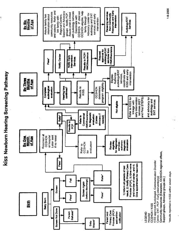 UNHS requires an entire community of health care providers to collaborate efforts to meet the hearing needs of infants and young children. No one agency alone could provide comprehensive service delivery to infants and young children throughout Kentucky. By expanding on the infrastructure of HHRR, the Kiss Project will enhance the networking of families, hospitals, medical homes, audiologists, early interventionists, and advocates. Each important piece of the young puzzles will be addressed so that a clear and accessible pathway is available for families to follow. On the next page you will find the Kiss Newborn Hearing Screening Pathway which depicts a patient's movement through the system. This pathway was developed based on the California UNHS model.