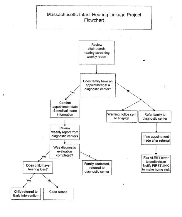 This project will to establish a follow-up system to ensure early diagnosis and access to intervention services for infants who do not pass screening and their families. As of 1998, Massachusetts law requires birth hospitals and birthing centers to screen all newborns and to provide results of screening to parent(s) or guardian(s). It mandates payment for newborn hearing screening by all payers, with the state as payer of last resort for un- or under-insured children (including those covered by ERISA-exempt plans). DPH is assigned responsibility for convening a broadly representative advisory committee and establishing regulations and guidelines for hearing screening. DPH is also mandated to certify centers with capacity to diagnosis newborn hearing loss. Thus the law creates a clear framework, with well defined fiscal and programmatic responsibilities, for universal screening and diagnosis.