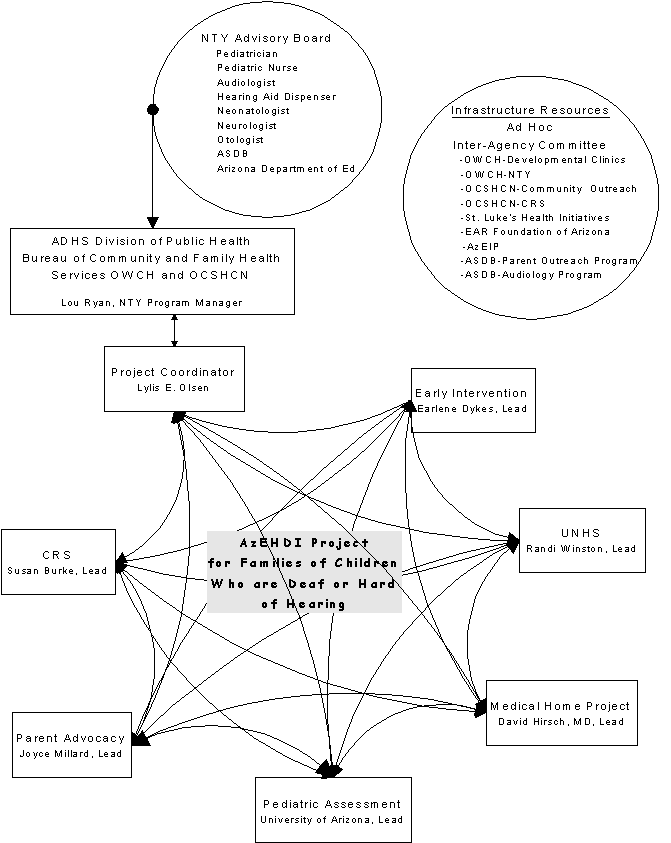 The lead agency on the Arizona Early Hearing Detection and Intervention (AzEHDI) project will be the Arizona Department of Health Services (ADHS). Participants in the project's core leadership team have extensive background and experience that makes them uniquely qualified to direct this project. Their positions of leadership within agencies and organizations will allow them to make the decisions and modifications necessary to assure the success of the project. Rosters of the NTY Advisory board and the Ad Hoc Inter-Agency Committee are included in appendices A and B.